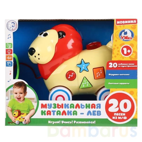 Музыкальная каталка «Лев» ТМ «УМка» - отличный подарок для вашего малыша.Игрушка выполняет функции 4 в 1:- слушаем: 20 веселых песен из любимых м/ф: «Песенка мамонтенка», «Облака», «Веселая карусель», «Песенка крокодила гены», «Антошка» и др.- учимся: расширяем словарный запас и кругозор- играем: к…