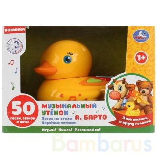 Эта яркая игрушка в виде милого утёнка непременно понравится вашему ребёнку. Малыш с удовольствием будет слушать песни на стихи известной детской поэтессы Агнии Барто, весёлые потешки и фразы.