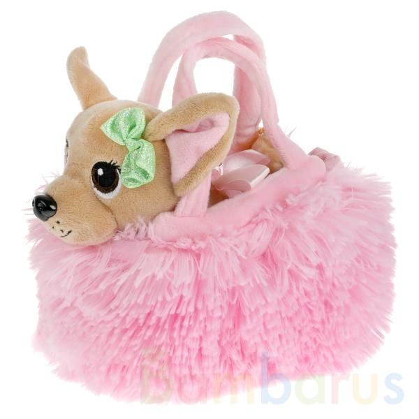 Шёрстка собачки сделана из мягкого материала, поэтому игрушку очень приятно обнимать и гладить. У питомца очаровательная мордочка, которая вызовет у ребёнка самые трепетные чувства. Голову щенка украшает зелёный бантик из блестящего материала. Меховая сумочка розового цвета придётся по вкусу маленьким модницам. Чихуахуа можно сажать в сумочку и брать с собой на прогулку или в гости.