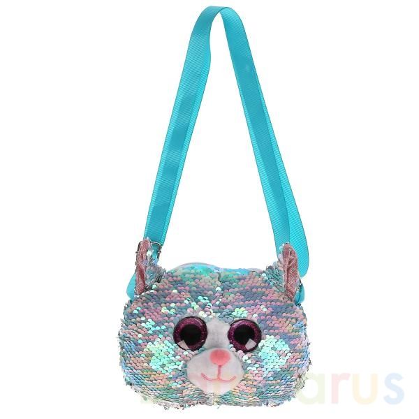 Эта очаровательная голубая кошечка с блестящими фиолетовыми глазами, розовым носиком и ушками из блестящего розового материала - не только милая игрушка, но и стильная сумочка. Сумка декорирована пайетками, красиво переливающимися на свету, а ручка выполнена из материала голубого цвета. С этой сумочкой ваша малышка сможет брать с собой на прогулку все самое необходимое.