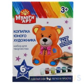 С этим набором ребёнок самостоятельно или с помощью родителей сможет расписать копилку в виде милого медвежонка. Для изготовления поделки в наборе имеется всё необходимое - нужно просто достать все предметы из упаковки и можно начинать творить! Раскрашенное изделие необходимо хорошенько просушить, затем его можно использовать в качестве копилки.