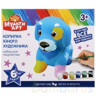 С этим набором ребёнок самостоятельно или с помощью родителей сможет расписать копилку в виде милого пёсика. Для изготовления поделки в наборе имеется всё необходимое - нужно просто достать все предметы из упаковки и можно начинать творить! Раскрашенное изделие необходимо хорошенько просушить, затем его можно использовать в качестве копилки.