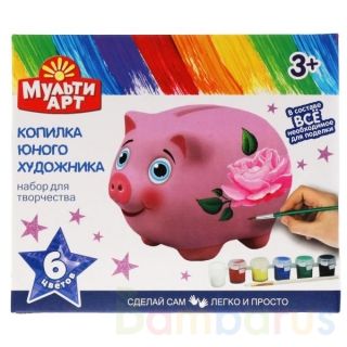 С этим набором ребёнок самостоятельно или с помощью родителей сможет расписать копилку в виде милой хрюшки. Для изготовления поделки в наборе имеется всё необходимое - нужно просто достать все предметы из упаковки и можно начинать творить! Раскрашенное изделие необходимо хорошенько просушить, затем его можно использовать в качестве копилки.