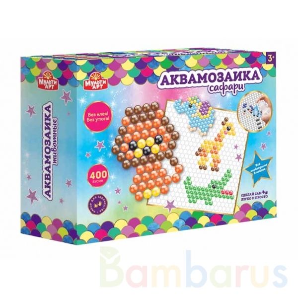 - в комплекте всё необходимое: пластиковая основа, цветные бусины, карточки-шаблоны, распылитель для воды, пинцет