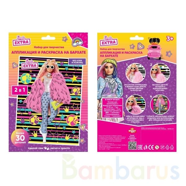 С помощью бархатной основы для раскрашивания, разноцветных фломастеров, сверкающих страз и элементов из мягкого материала маленькая поклонница куклы Барби сможет самостоятельно создать яркую аппликацию с изображением любимого персонажа, которую можно подарить родным, друзьям или использовать для украшения детской комнаты.