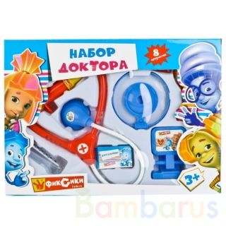 Набор с весёлыми персонажами мультсериала "Фиксики" станет отличным подарком для ребёнка, который любит играть в доктора. Он влючает в себя предметы, напоминающие настоящие медицинские приборы: шприц, стетоскоп и другие. Элементы выполнены из безопасного для ребёнка материала. Комплект окрашен ярки…