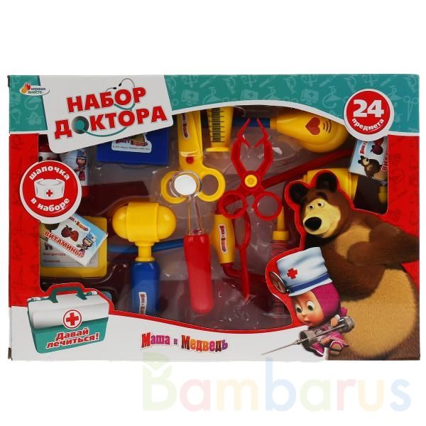 Набор станет прекрасным подарком для деток. Он предназначен для сюжетно-ролевых игр малышей, заинтересованных медициной. Комплект состоит из 24 предметов, которые необходимы для осмотра пациентов и их лечения. Игрушки выполнены из прочного пластика с высокой степенью детализации. Они украшены яркими наклейками с изображением героев любимого детского мультика. Инструментарий упакован в коробку. С набором доктора "Маша и Медведь" ребенок сможет погрузиться в увлекательную игру и "вылечить" всех своих кукол и мишек. Развает фантазию и воображение. В процессе игры вырабатываются ловкость и слаженность движений рук, мелкая моторика и координация. Рекомендовано детям от 3-х лет.
