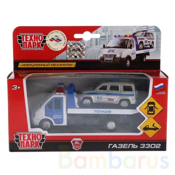 Маленький эвакуатор "Газель 3302" является уменьшенной копией настоящей машины. Он выполнен в белом и синем цвете с надписями "ДПС" и "Полиция" по бокам, оснащён инерционным механизмом. У кабины есть мигалка, открываются двери, что делает игру более реалистичной. В набор входит легковая серебристая машина, изготовленная из прочного пластика. Играя с набором, ребёнок сможет придумать интересные и захватывающие сюжеты, развивать фантазию и мелкую моторику рук. Рекомендовано детям от 3-х лет.