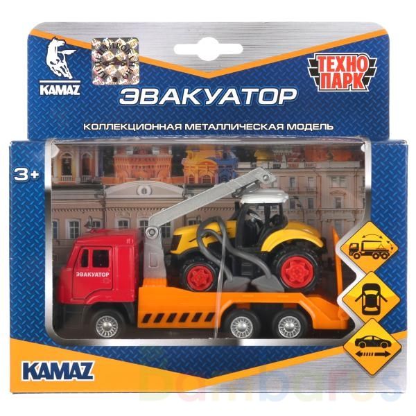 Набор металлических моделей «КамАЗ. Эвакуатор» ТМ «Технопарк» - прекрасный подарок для ребёнка:- открываются двери- подвижные элементы- трактор в комплекте- инерционный механизм (поставьте машинку на ровную поверхность, потяните за корпус назад, отпустите и она начнёт быстро двигаться вперёд)Металл…