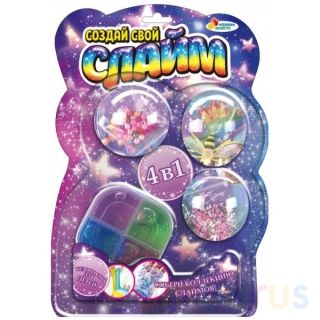 - все необходимое в наборе: баночка с 4 прозрачными разноцветными слаймами, 2 пакетика с украшениями, мини-игрушка