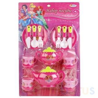 НАБОР ПОСУДЫ "ИГРАЕМ ВМЕСТЕ" НА БЛИСТЕРЕ (РУСС. УП.) в кор.2*24шт С миниатюрным набором посуды ребёнок без труда устроит чаепитие своим куклам и игрушкам. В набор входит заварочный чайник, сахарница, 4 чашки и 2 блюдца, 2 ложки, 2 вилки и 2 ножа. Предметы выполнены в розовом-салатовом цвете, на них нанесены изображения персонажей диснеевских мультфильмов: Золушка, Белоснежка и Русалочка. Аксессуары из набора окрашены стойкими безопасными красителями, которые долгое время сохраняют свой первоначальный цвет. В процессе игры развивается мелкая моторика, воображение и образное мышление. Рекомендовано детям от 3 лет. Товар лицензирован.