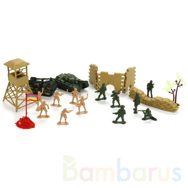 Набор солдатиков «Играем вместе» - эксклюзивная модель для поклонников сюжетно-ролевых игр. В наборе 20 предметов: фигурки бойцов и деревьев, флаг с подставкой, элементы, из которых можно собрать здание. Все детали изготовлены из качественного пластика. Подходит для сюжетных игр, развивает фантазию и воображение. Для детей от трех лет.
