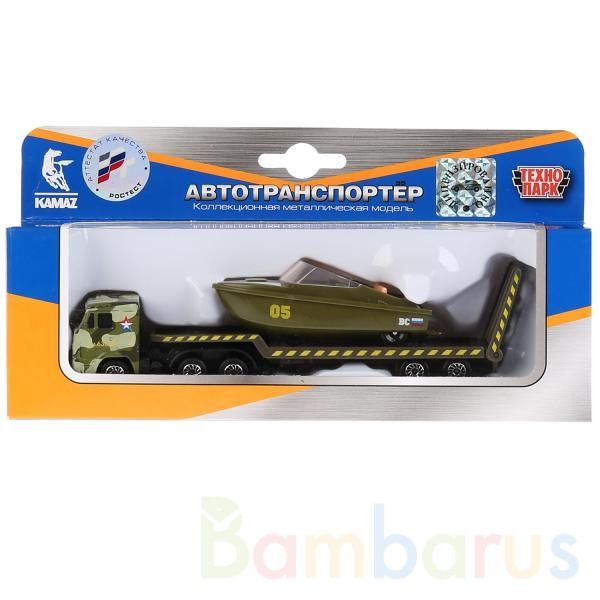 НАБОР "ТЕХНОПАРК" МЕТАЛЛ. КАМАЗ ТРАНСПОРТЕР ВОЕННЫЙ С ЛОДКОЙ В РУСС. КОР. в кор.2*72шт Прекрасный военный набор для подарка Вашему мальчику. В набор входит Камаз транспортер, точная копия настоящего, высоко дентализированная модель с кузовом, на котором стоит военная лодка размером 7,5 см. Камаз может первозить лодку куда угодно! Игра с набором совершенствует моторику рук и координацию движений ребёнка. Придумывая увлекательные сюжеты для игры, дети стимулируют свою фантазию и воображение. Рекомендовано детям от 3-х лет.