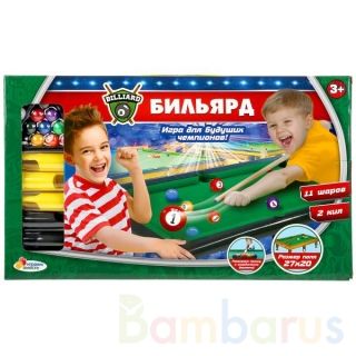 Настольная игра «Бильярд» – детская версия известной стратегической игры.В комплекте:- бильярдный стол- размер поля: 27х20 см- 2 кия- 11 шаровЗадача игроков – закатить шары в лузы и таким образом набрать большее количество очков. Игра рассчитана на двух игроков. С бильярдом можно интересно и увлека…