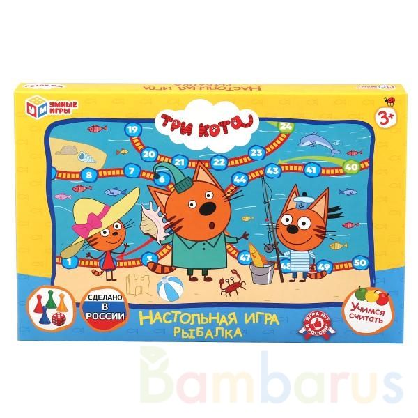 Настольная игра-ходилка «Три кота. Рыбалка» ТМ «Умные игры» основана на одноименном мультфильме, который так нравится детям веселой семьёй котиков и интересными сюжетами.
