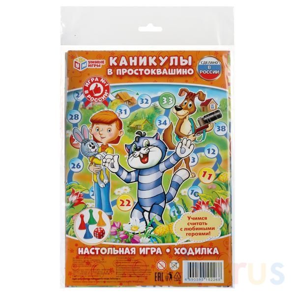 Игра-ходилка способствует развитию фантазии малыша и формированию логических связей, он учится принимать решения и самостоятельности. А мультипликационные герои известного мультфильма "Трое из Простоквашино" станут верными помощниками ребенка в игре и поднимут настроение. Участники игры выбирают фишку определенного цвета и располагают их на старте. Фишка двигается на то количество клеток, которое выпадет при броске кубика. Выигрывает тот игрок, который первый дойдет до финиша. Все особенности игры и правила игры размещены на упаковке. В настольной игре могут участвовать от 2 до 4 игроков. В наборе: игровое поле, кубик, 4 фишки. Материал: картон, пластик. Развивает логическое мышление, мелкую моторику, учит счету. Рекомендовано детям от 3-х лет.