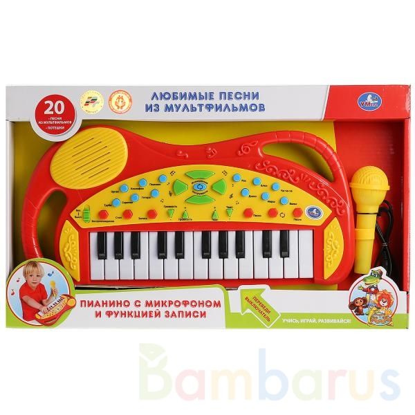 Обучающее пианино "20 любимых песен" ТМ "УМка" с микрофоном - новинка, которую полюбит каждый малыш. Оно выполнено из прочного пластика, все детали окрашены в яркие цвета. У игрушки есть черные и белые клавиши, разноцветные кнопки с разными функциями. При нажатии на них ребёнок услышит 20 любимых песен из мультфильмов. Ребёнок также сможет взять пианино с собой и везде носить его с собой, держа за удобную ручку. При нажатии на кнопки загораются разные лампочки. Микрофон позволяет записывать композиции, которые составит ребёнок. Развивает музыкальный слух, мелкую моторику, артистизм, память. Рекомендуется детям от 3 лет.