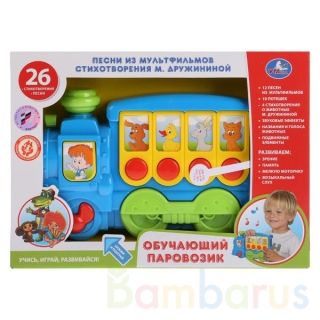 Обучающий паровозик «Песни из мультфильмов и стихотворения М. Дружининой» - новинка ТМ «УМка» для раннего развития детей. Игрушка изготовлена из высококачественной пластмассы, оснащена звуковыми и световыми эффектами, снабжена подвижными элементами, может использоваться в качестве каталки. Воспроизводит 12 песен из любимых мультфильмов, 10 потешек, 4 стихотворения М. Дружининой о животных, названия и голоса животных. Озвучено профессиональными актёрами. Игрушка развивает слух, мелкую моторику, сенсорное восприятие, фантазию и память ребёнка, прививает любовь к музыке, расширяет кругозор. Качество подтверждено аттестатом РОСТЕСТ. Рекомендовано для детей старше 1 года. Товар лицензирован. В комплекте батарейки АА*2.