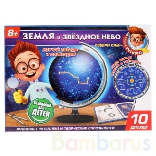 С этим занимательным набором ребёнок самостоятельно или с помощью родителей сможет собрать глобус звёздного неба. Юный астроном наглядно увидит, что такое небесная сфера и какие созвездия видны в определённое время года. Готовой моделью можно украсить интерьер детской комнаты и продолжать изучать созвездия.