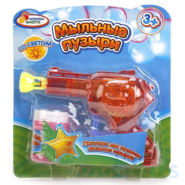 Пистолет для пускания мыльных пузырей "Играем Вместе" станет настоящим развлечением для детей. Использовать пистолет желательно на улице или в ванной, поскольку он выдувает громадное количество мыльных пузырей. В набор входит пузырёк с мыльным раствором на 50 мл и сам пистолет. Игрушка оснащена световыми эффектами. Рекомендовано детям от 3 лет.