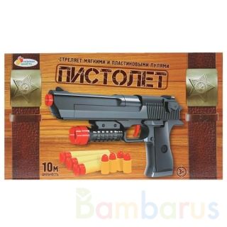 Пистолет с мягкими и пластиковыми пулями - новая разработка ТМ «Играем вместе». Он изготовлен из качественной, прочной пластмассы. В комплект входит 3 мягкие и 4 пластиковых пули. Дальность стрельбы достигает 20 метров. Пистолет поможет в ролевых играх развить фантазию мальчиков, чувство ответственности, координацию движения и мелкую моторику. Качество игрушки подтверждено сертификатом РОСТЕСТ. Рекомендовано к использованию детьми старше 3 лет.