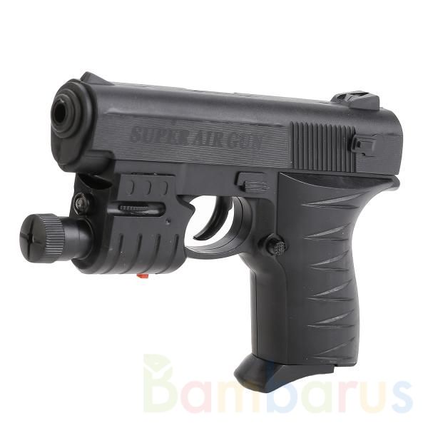 Такой пистолет будет отличным подарком будущим защитникам отечества. Посмотрите, как он похож на настоящий! Для того, чтобы не промахнуться игрушка оборудована фонариком и лазерным прицелом. Для стрельбы используйте пульки из набора. С таким игрушечным оружием ваш малыш будет самым метким стрелком…