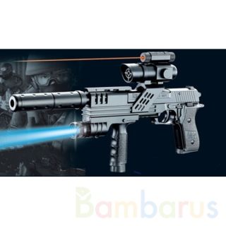 Игровой «Пистолет» с лазерным прицелом и фонариком станет отличным подарком для юного стрелка.