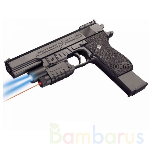 Такой пистолет будет отличным подарком будущим защитникам отечества. Посмотрите, как он похож на настоящий! Для того, чтобы не промахнуться игрушка оборудована фонариком и лазерным прицелом. С таким игрушечным оружием ваш малыш будет самым метким стрелком! Такие игрушки пригодятся для воспитания патриотизма в детях, помогут развить внимательность и координацию движений. Игрушка сертифицирована. Рекомендуется для детей старше 6 лет.