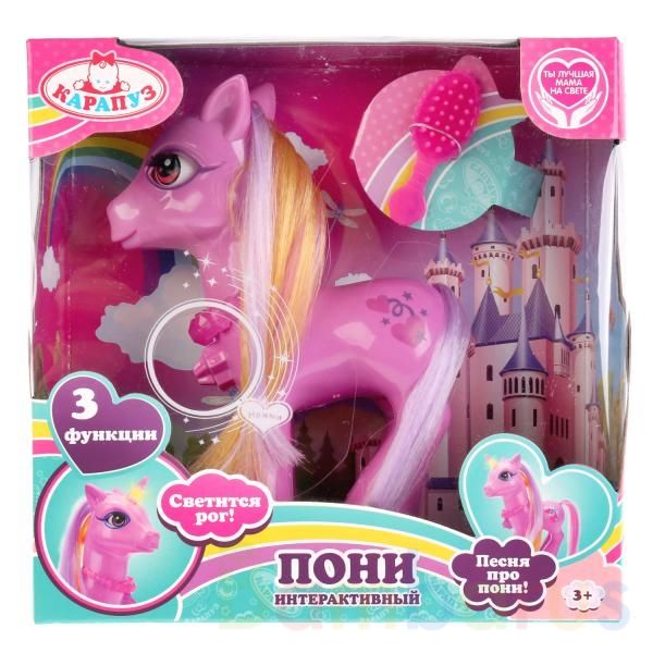 Эта очаровательная игрушка доставит радость любому ребенку. Детям понравится наблюдать, как пони поворачивает голову и моргает глазками. Пони споет песенку и расскажет стишок, если нажать на кнопку-звездочку на его груди. У пони красивые волосы, которые можно расчесывать и делать красивые прически…
