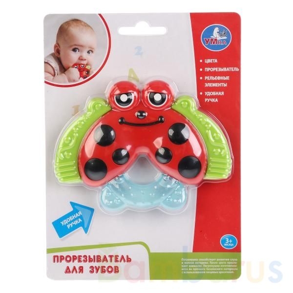 Прорезыватель "Божья коровка" - это уникальная новинка ТМ "УМка" для самых маленьких. Игрушка сделана из прочного, безопасного и экологически чистого материала в ярких цветах. Верхняя часть выполнена из пластика, а нижняя представляет собой силиконовый прорезыватель с водой внутри. Её можно грызть и кусать, когда у малыша только появляются зубки и чешутся дёсны. Дополнена рельефными элементами и небольшой ручкой, за которую удобно держать игрушку. Рекомендуется детям от 3 месяцев.