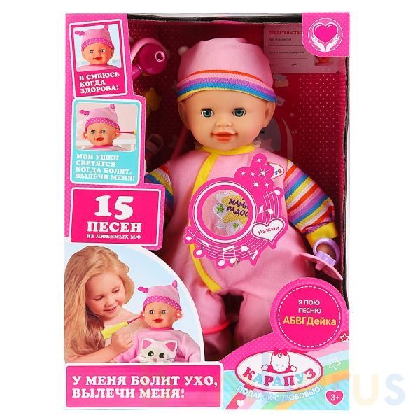 Интерактивная кукла «Женечка» ТМ «Карапуз» станет отличным подарком.Функции:- поёт песенки из любимых мультфильмов: «АБВГДейка», «Вместе весело шагать», «Всё мы делим пополам», «Дважды два четыре», «Если с другом вышел в путь», «Мамонтенок», «Облака, белогривые лошадки», «От улыбки», «Песня про пап…