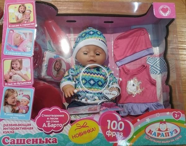 Развивающий интерактивный пупс с аксессуарами «Сашенька» ТМ «Карапуз» станет прекрасным подарком для вашего ребёнка: - знает стихотворения и песни на стихи Агнии Барто- говорит 100 фраз- пьёт из бутылочки- ходит на горшок- закрывает глазкиВ комплекте:- соска- горшок- бутылочка- тарелка- подгузник- …