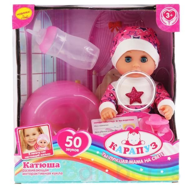 Интерактивная кукла «Катюша» ТМ «Карапуз» станет отличным подарком:- 15 фраз: «Спой мне колыбельную песенку», «Расскажи сказку, мамочка», «Покорми меня, мамочка», «Одень меня потеплее, мамочка», «Мама», «Папа» и др.- 50 детских звуков: смех, лепет, гуление, плач, кашель, чихание, кряхтение, капризы…