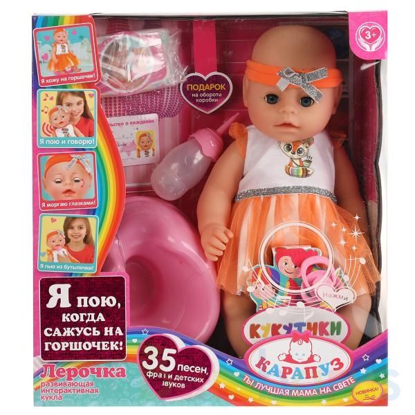 Развивающая интерактивная кукла с аксессуарами «Лерочка» ТМ «Карапуз» станет отличным подарком для вашей принцессы:- 35 фраз, песен и звуков- 10 песен «Кукутиков» (фрагменты): «Зарядка», «Каша», «Мама», «Пупсик» и др.- фразы: «Я испачкалась, мамочка! Переодень меня, пожалуйста!», «Я люблю тебя, мам…
