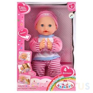 Интерактивная кукла ТМ «Карапуз» станет прекрасным подарком для вашей принцессы:- хлопает в ладоши- считает до 10 на английском языке- поёт песню из м/ф «Бюро находок»- знает потешку «Ладушки, ладушки, мы пекли оладушки»Этот милый пупс, с детально проработанным личиком, обязательно понравится вашей…