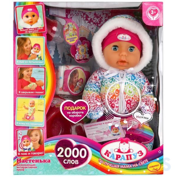 Интерактивный пупс «Настенька» ТМ «Карапуз» станет замечательным подарком для вашей принцессы:- поёт 5 песен: «Мамочка» (Волшебники Двора), «Песня Мамонтёнка» (из м/ф «Мама для Мамонтёнка»), «У друзей нет выходных» (Барбарики), «Антошка» (из одноимённого мультфильма), «Что такое доброта?» (Барбарик…