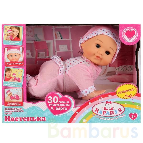 Развивающий интерактивный пупс «Настенька» ТМ «Карапуз» станет замечательным подарком для вашей принцессы:- поёт 14 песен на стихи А. Барто: «Лошадка», «Бычок», «Зайка», «Мячик», «Козлёнок», «Кораблик», «Мишка», «Ути-ути», «Фонарик», «Слон», «Воробей», «Грузовик», «Лягушата», «Самолёт»- рассказывае…