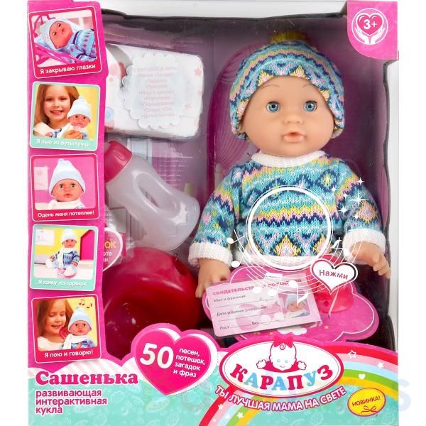 Развивающая интерактивная кукла с аксессуарами «Сашенька» ТМ «Карапуз» станет прекрасным подарком для вашего ребёнка: - поёт 6 песенок: «Что такое доброта?», «Песня Мамонтёнка», «Добрый жук», «Царевна Лягушка», «От улыбки», «Колыбельная медведицы»- рассказывает 2 потешки- знает 5 загадок о природе …