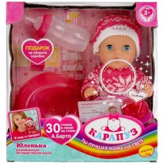 Интерактивный пупс «Юленька» ТМ «Карапуз» станет замечательным подарком для вашей принцессы:- поёт 14 песен на стихи А. Барто: «Лошадка», «Мячик», «Бычок», «Козлёнок», «Зайка», «Кораблик», «Ути-ути», «Фонарик», «Мишка», «Слон», «Воробей», «Грузовик», «Лягушата», «Самолёт»- рассказывает 16 стихотвор…