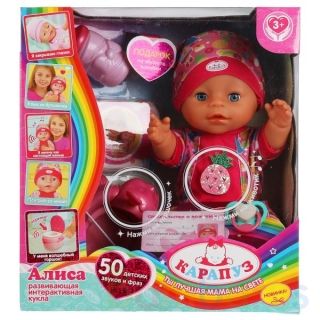 Развивающая интерактивная кукла «Алиса» ТМ «Карапуз» станет прекрасным подарком для вашего ребёнка:- произносит 15 фраз: «Спой мне колыбельную песенку», «Расскажи сказку, мамочка», «Покорми меня, мамочка», «Одень меня потеплее, мамочка», «Поменяй мне памперс», «Возьми меня на ручки, мамочка», «Я та…
