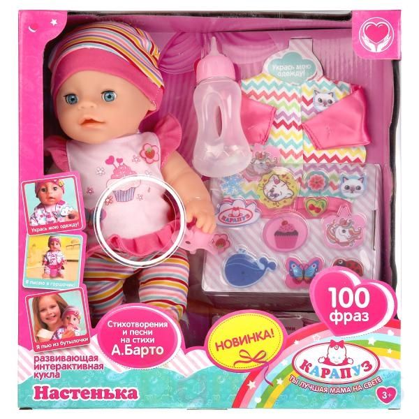Развивающая интерактивная кукла «Настенька» ТМ «Карапуз» – озвученная игрушка, которая знает 100 фраз. Рассказывает и поёт - стихотворения и песни на стихи А.Барто («Лошадка», «Бычок», «Мячик», «Зайка», «Козлёнок», «Кораблик», «Мишка»)