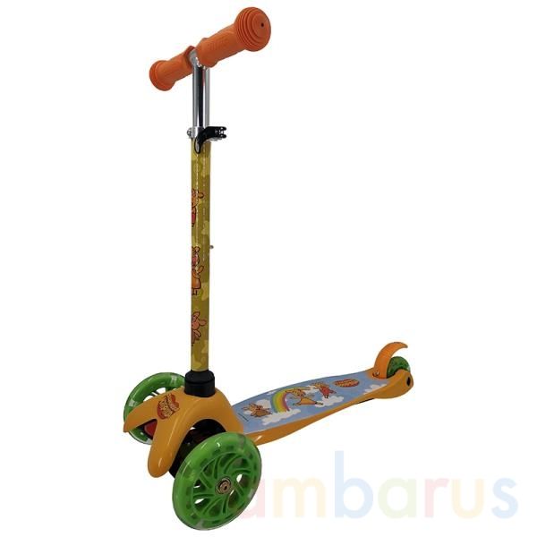 Самокат 3х-колесный;Размер в собранном виде (ДхШхВ): 54х26х48-66 см;Регулируемая высота рулевой стойки: 48-66 см;Материал: пластик с элементами металла;Колеса: из полиуретана, светящиеся, передние 120мм, заднее 76 мм;Подшипники: ABEC-7;Платформа: антискользящее покрытие, размер (ДхШ) - 29х11 см;Нож…