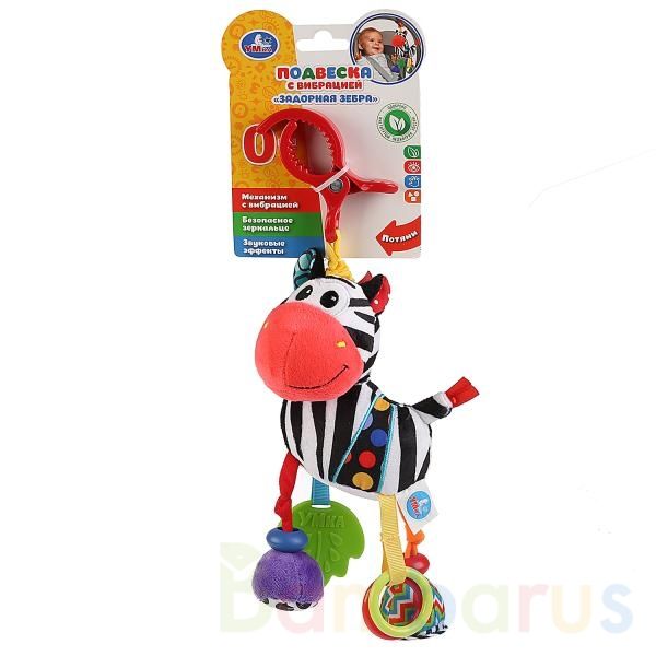 Развивающая игрушка-подвеска с погремушками «Задорная зебра» ТМ «УМка».«Задорная зебра» - это оригинальная яркая игрушка-погремушка, которую можно легко и удобно закрепить на коляске или детской колыбельке. Игра с такой весёлой погремушкой тренирует моторику, развивает фантазию и воображение ребёнк…