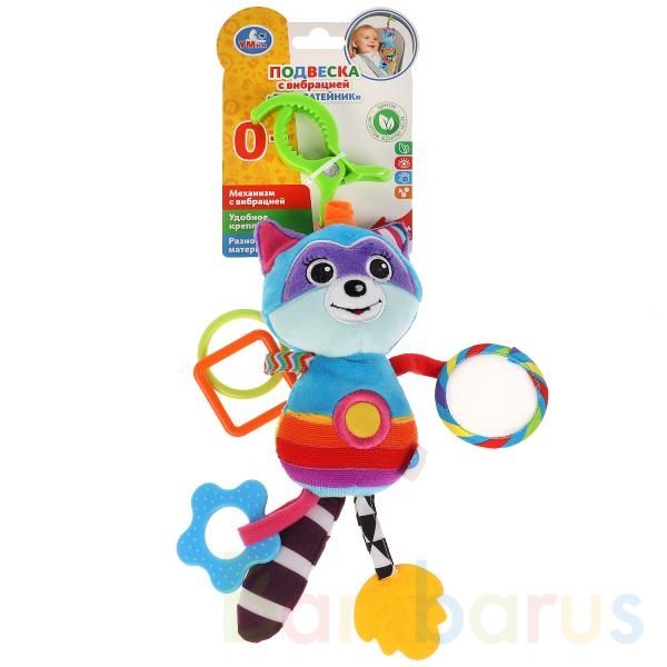 Эта очаровательная игрушка в виде милого енота с забавным вибрационным эффектом непременно приведёт ребёнка в восторг. Подвеска выполнена в ярких цветах из очень мягкого и гипоаллергенного материала. Благодаря креплению-клипсе игрушку удобно крепить к кроватке, коляске или дуге. Прорезыватель интересной формы из качественного безопасного материала пригодится малышу, когда у него будут резаться зубки.