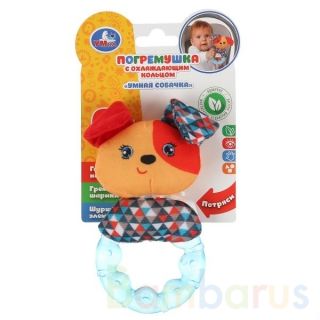 Развивающая текстильная игрушка-погремушка с охлаждающим кольцом «Умная собачка» ТМ «УМка».«Умная собачка» - это оригинальная яркая игрушка-погремушка в виде милого щеночка. Игра с такой весёлой погремушкой тренирует моторику, развивает фантазию и воображение ребёнка, его слуховое и зрительное восп…