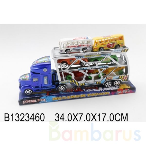 Трейлер с набором автомоделей порадует любого юного автолюбителя! Этот массивный 3-этажный автовоз с мощным инерционным механизмом будет незаменимым помощником малыша в играх с машинами, а 2 автобуса и набор авто успешно дополнят его коллекцию моделей. С таким трейлером ребёнок придумает необыкновенные приключения и сможет справиться с любыми препятствиями и авариями в играх! Игрушка сертифицирована, представлена в ассортименте, рекомендуется для детей старше 3 лет.