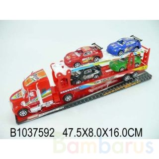 Трейлер с набором автомобилей порадует любого юного автолюбителя! Этот массивный автовоз с мощным инерционным механизмом будет незаменимым помощником малыша в играх с машинами, а 4 гоночных авто успешно дополнят его коллекцию моделей. С таким трейлером ребёнок придумает необыкновенные приключения и сможет справиться с любыми препятствиями и авариями в играх! Игрушка сертифицирована, представлена в ассортименте, рекомендуется для детей старше 3 лет.