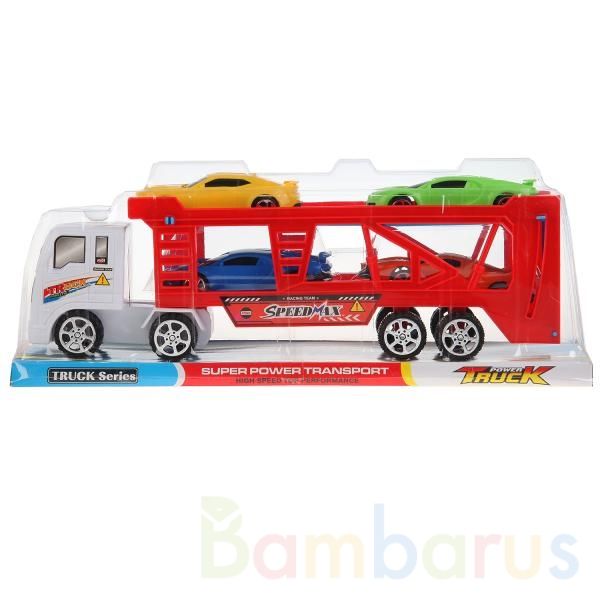 Красно-белая машина-трейлер перевозит машинки поменьше. С такой яркой игрушкой ребёнку будет весело и интересно играть, можно как перевозить машинки на автовозе, так и играть со всеми пятью машинками по отдельности.