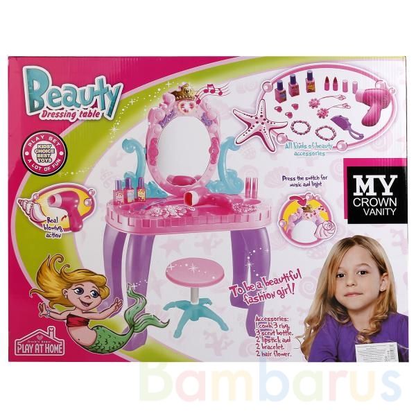Такой великолепный игровой набор «Туалетный столик» понравится маленьким модницам, украсит комнату малышки и подарит массу незабываемых впечатлений! Небольшой столик на ножках дополнен резным зеркалом с цветными камешками, светом и звуком. На столике удобно размещается фен, расчёска, набор космети…