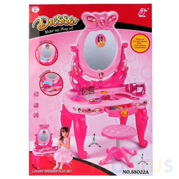 Такой великолепный игровой набор «Зеркало-столик» понравится маленьким модницам, украсит комнату малышки и подарит массу незабываемых впечатлений! Небольшой столик на ножках дополнен резным зеркалом с цветными камешками, светом и звуком. На столике удобно размещаются фен, расчёска, набор косметики, губная помада, лак для ногтей и бижутерия. В выдвижной ящичек можно сложить аксессуары. Разместиться перед зеркалом будет удобно на стульчике из комплекта. Световые и звуковые эффекты комплекта работают от 3 батареек АА. С таким комплектом и вашей помощью маленькая принцесса сделает себе прекрасную причёску и макияж и будет неотразимой на любом празднике! Высота столика: 69 см. Качество подтверждено сертификатом. Рекомендовано для детей старше 3 лет.